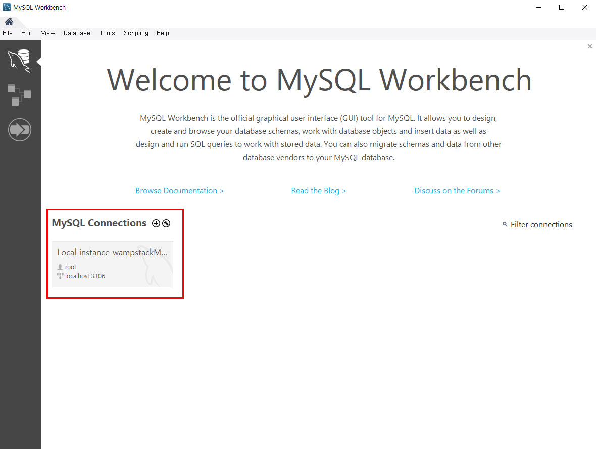 위와 같은 화면이 나온다면 이제 MySQL Workbench를 사용할 준비가 끝난 것입니다.